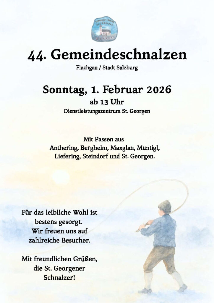 | 16.02.2025 Sonntag | 43. Gemeindeschnalzen im Salzburger Flachgau in Steindorf 13:00 Uhr Beginn des Preisschnalzens anschließend gemütliches Beisammensein und Preisverteilung in der Dorfsinger-Halle in Strasswalchen mit der TMK Strasswalchen Anfahrtsplan Ausrichter: Schnalzergruppe Steindorf |